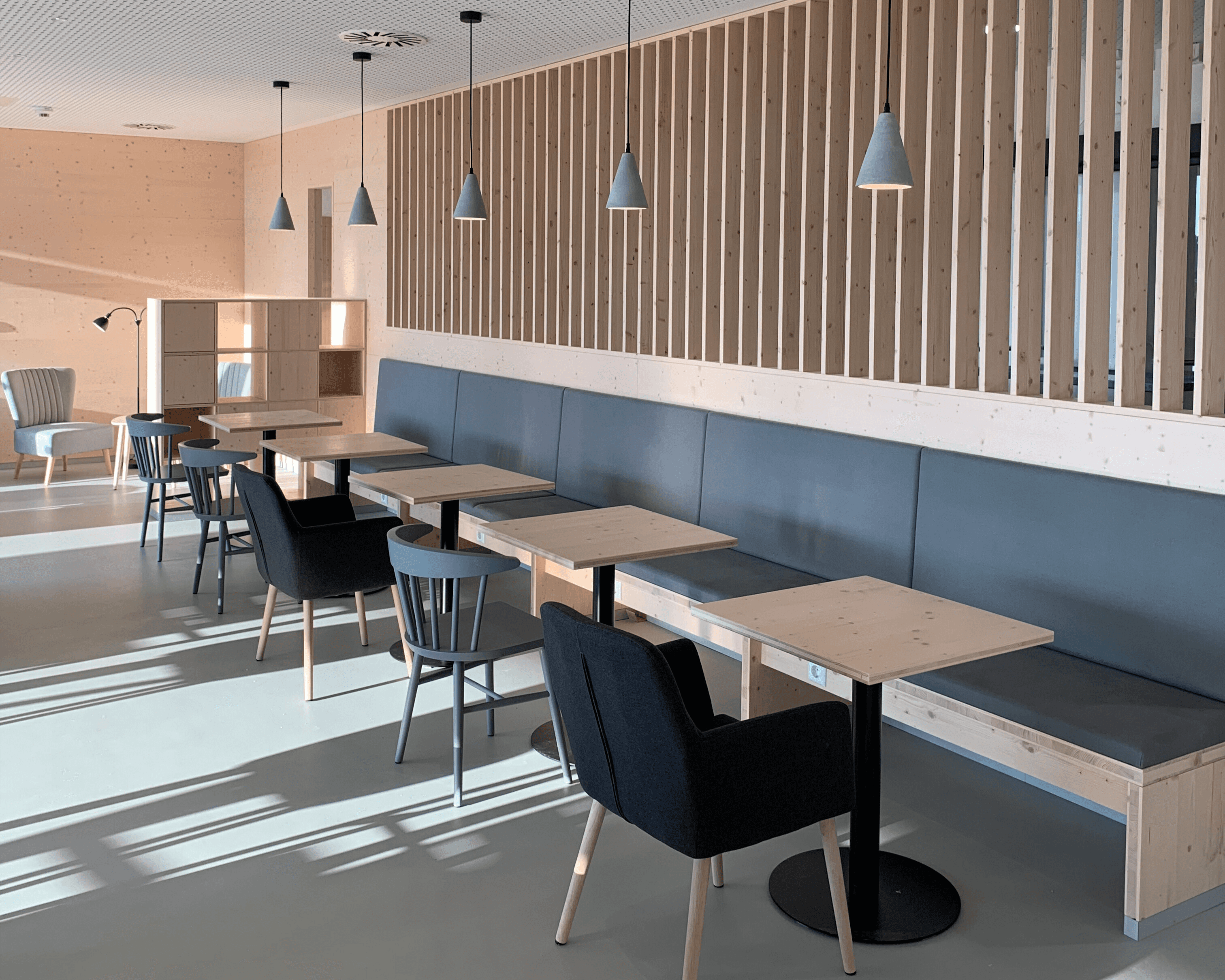 Ein unbeliebter Aufenthalts- & Durchgangsbereich wird zur einladenden Cafeteria, ein ganzes Rehazentrum zum Naturerlebnis – Raumkonzepte, die Genesung fördern.