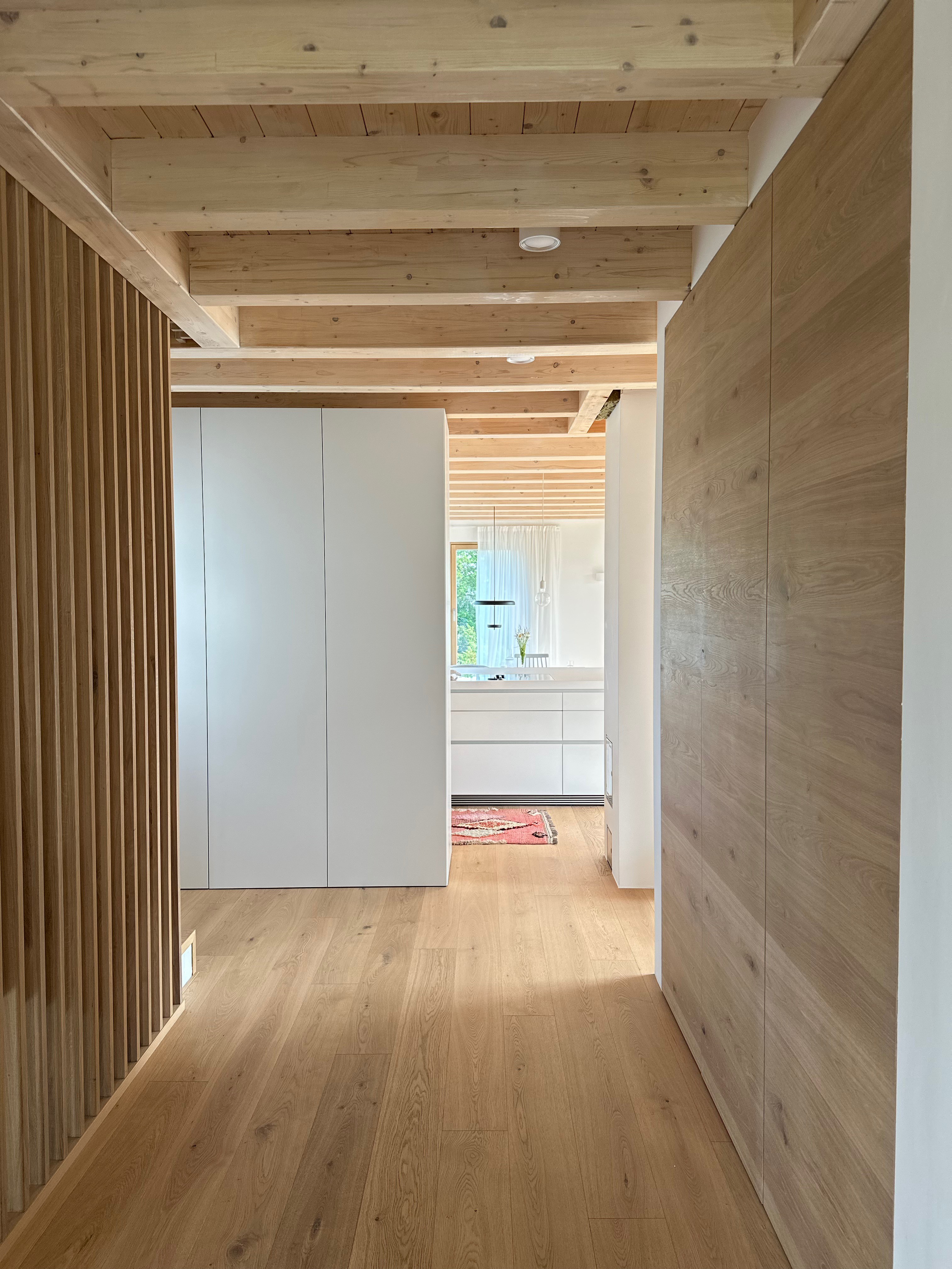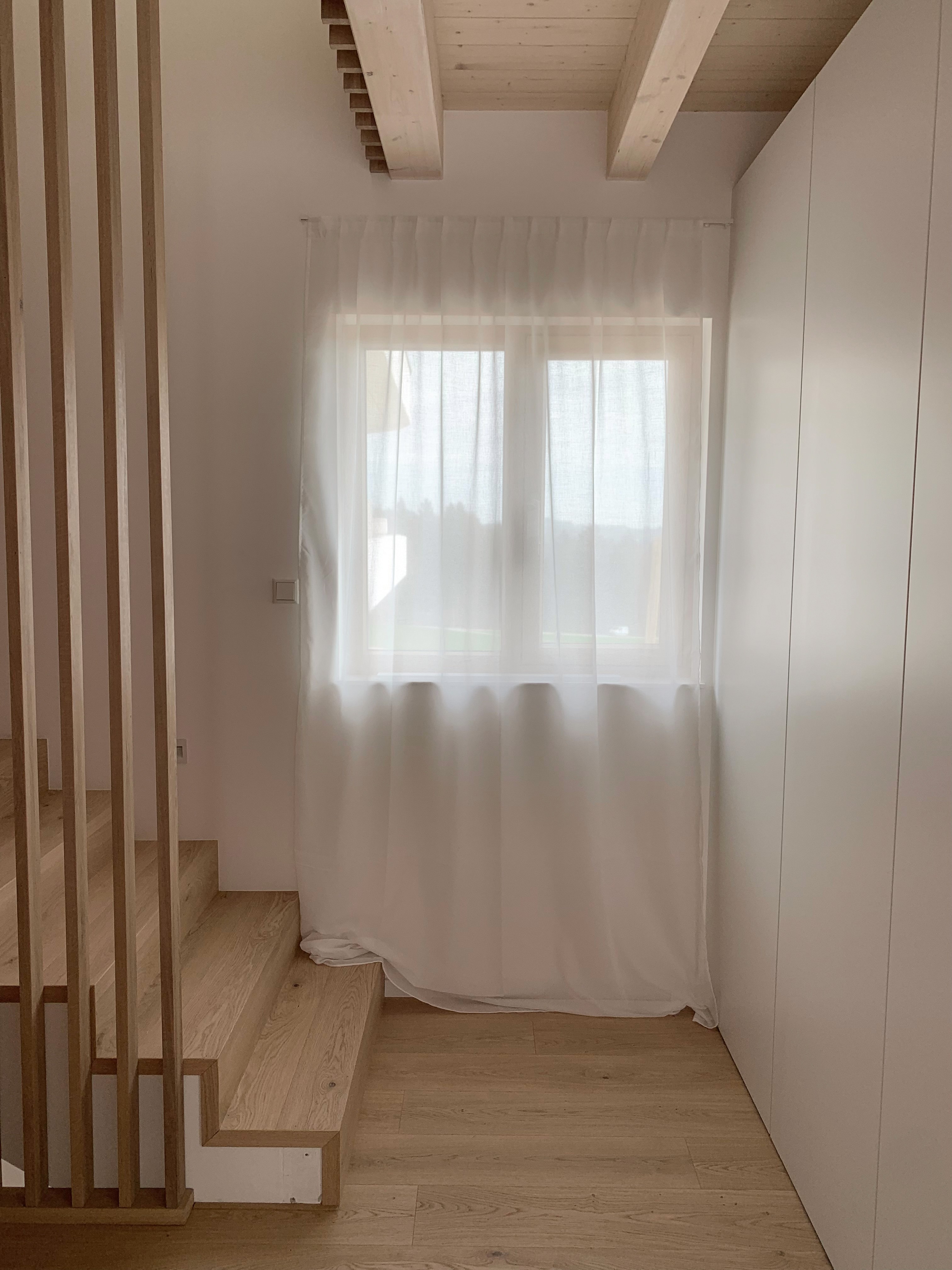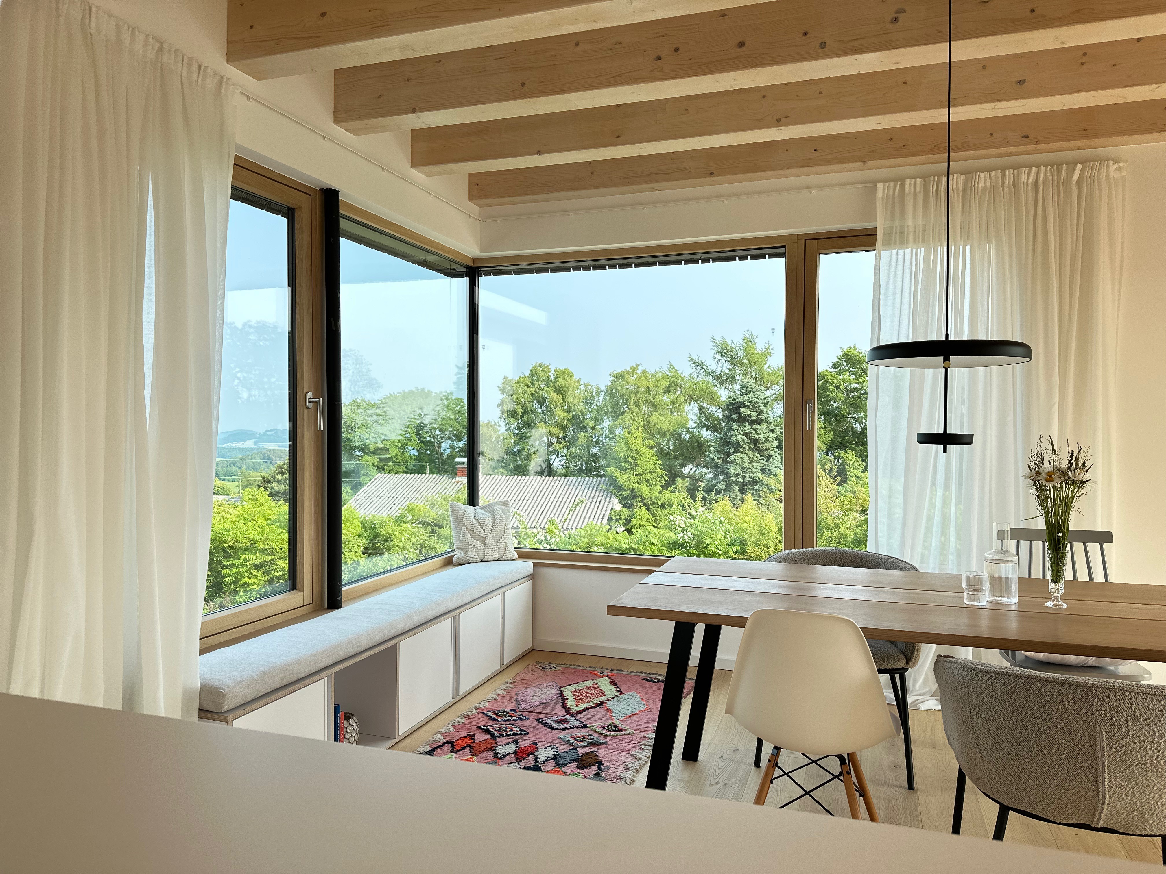 "Wir haben das Haus als Ganzes betrachtet, nicht als Summe einzelner Räume," erklärt Lisa Lindinger. Bereits im Planungsstadium begannen wir, die Materialien, Oberflächen und späteren Einrichtungselemente aufeinander abzustimmen. So entstand ein modernes skandinavisches Konzept, das die besondere Architektur abrundet.